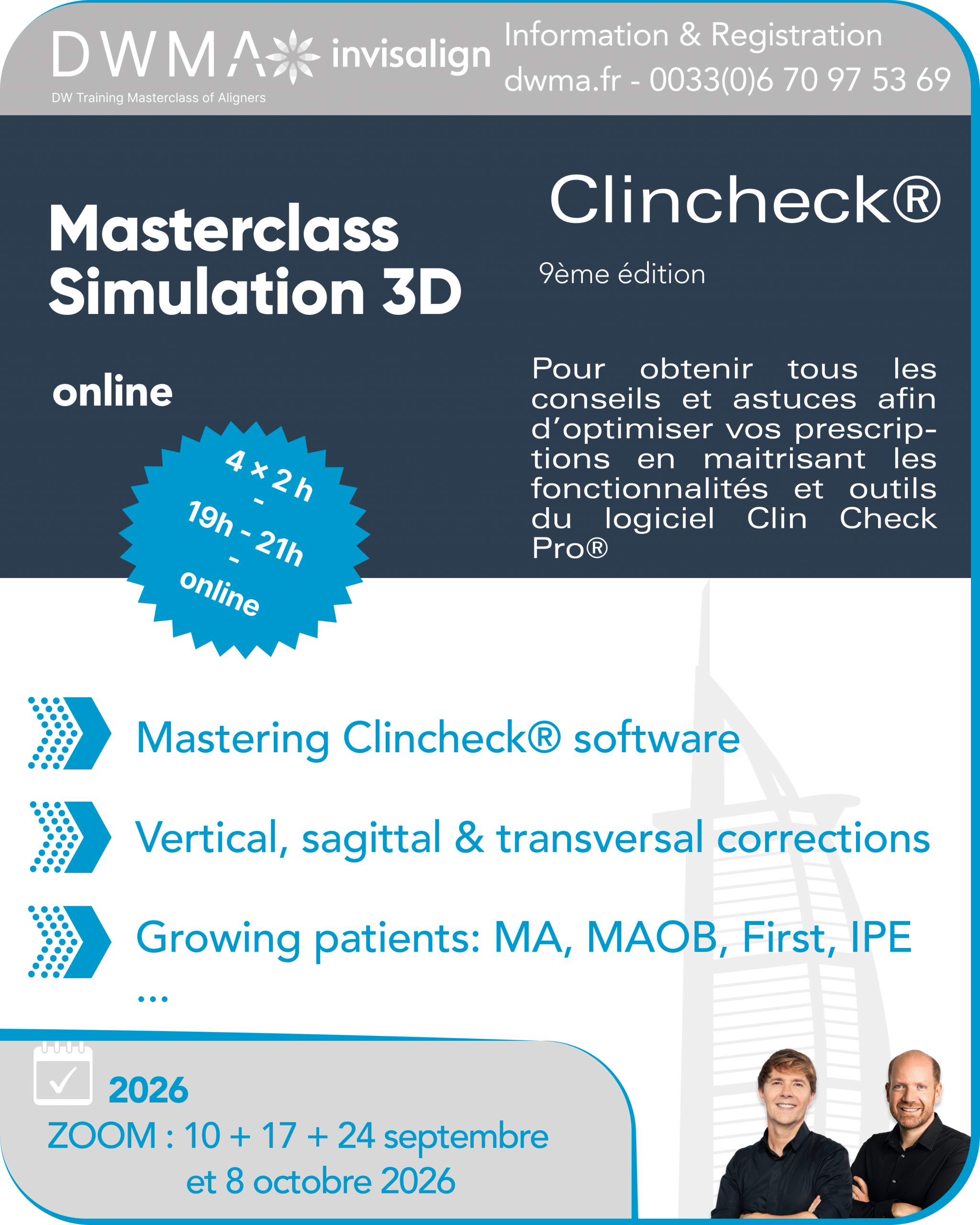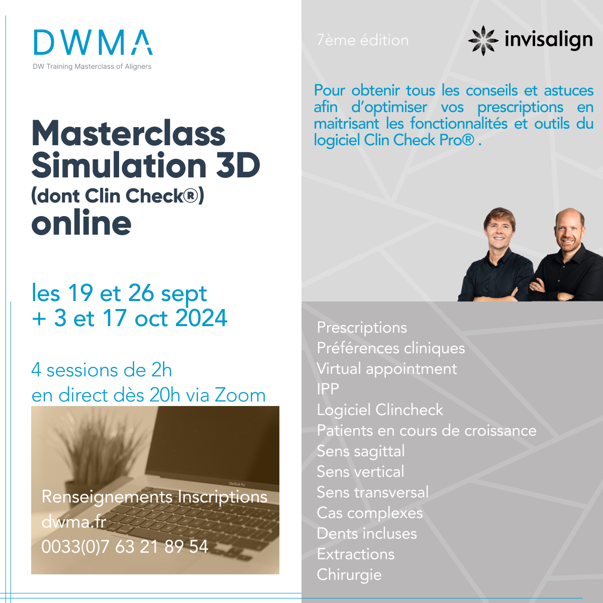 Outils : Un ordinateur portable afin d’accéder à l’interface IDS (Invisalign Doctor Site) et au logiciel ClinCheck Pro® ainsi qu’une connexion Internet haut débit sont nécessaires pour le suivi de la formation.
