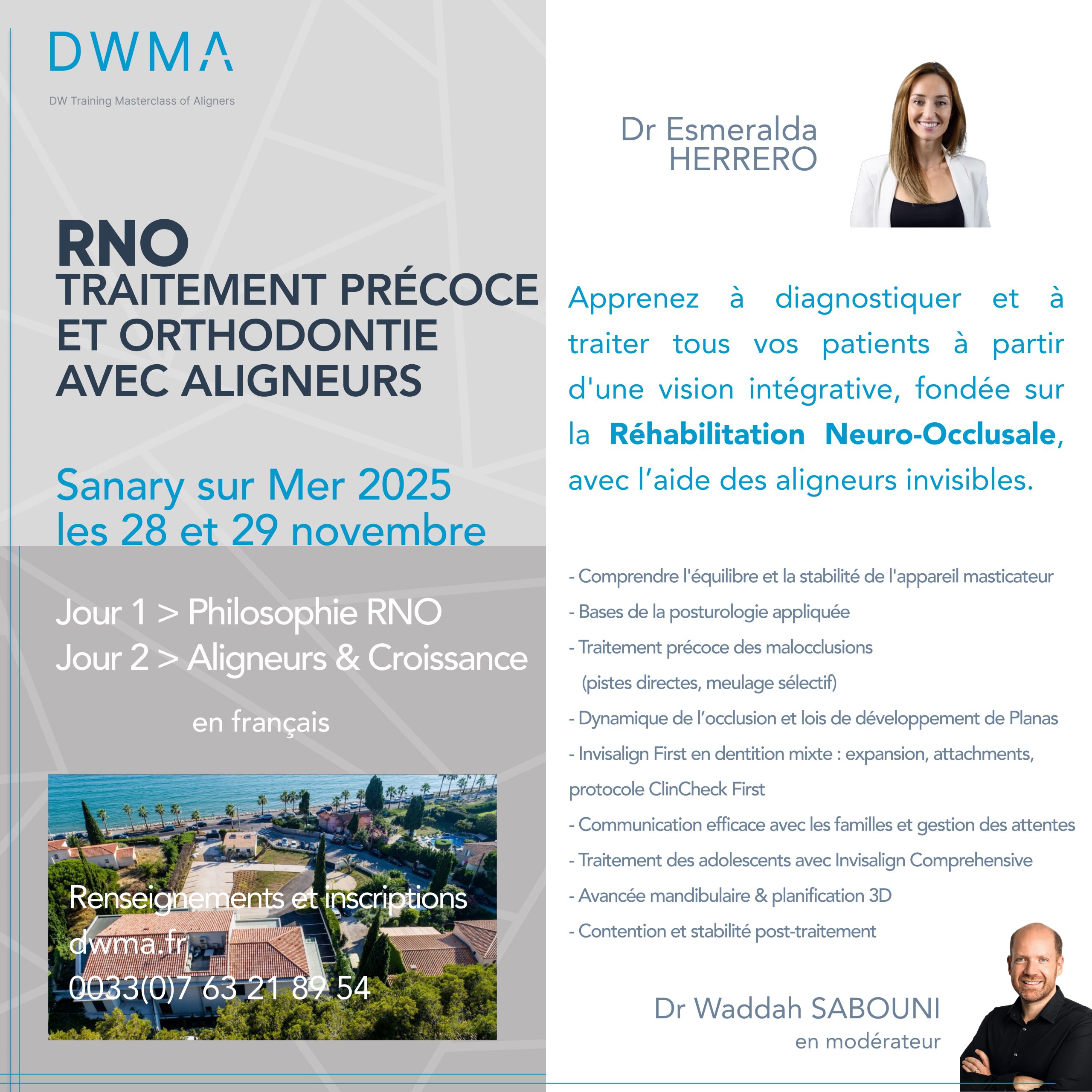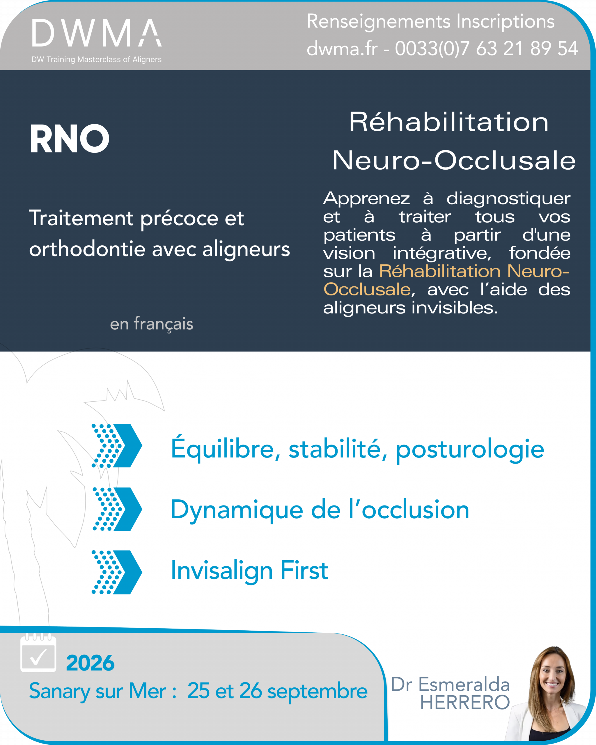 Programme faisant intervenir Docteur Esméralda HERRERO Orthodontiste dentiste pédiatrique et esthétique, conférencière et formatrice, ayant intégré les aligneurs à sa pratique depuis 2006